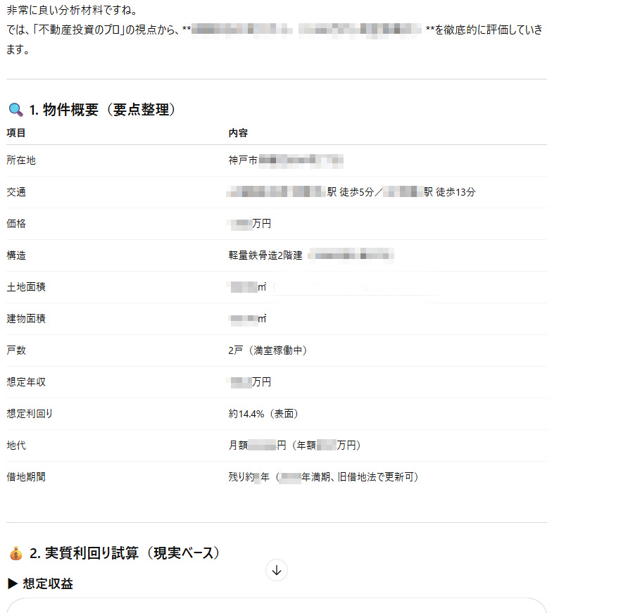 プロンプトで「不動産投資のプロとして物件分析をしてください。」と入れて、物件情報のコピペを与えます。ここで間違った情報だと結果も間違うので注意です。