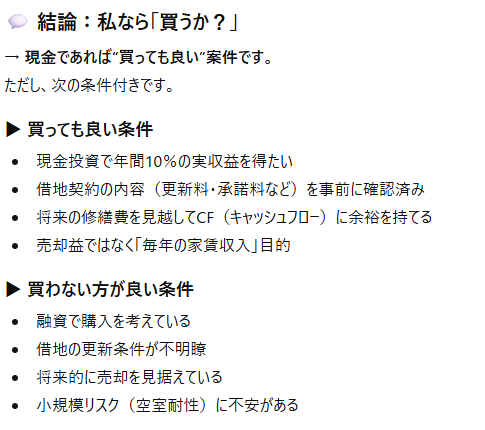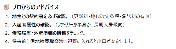 これはAIでも人間(仲介業者や先輩大家など)からの紹介・評価でも同じで、最後は自身で再度調べ上げ、現地まで確認しに行くことで最終的な判断を下すべきだと思います。