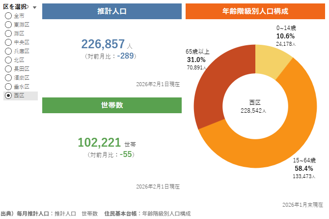 それを表すように人口は神戸市でも一番多い約23万人、約10万世帯が暮らしています(※)。