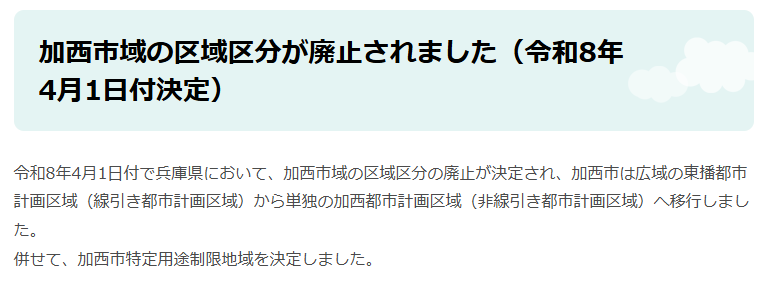 兵庫県加西市が、令和8年4月1日より市街化調整区域が「全廃」になった・・という内容です。